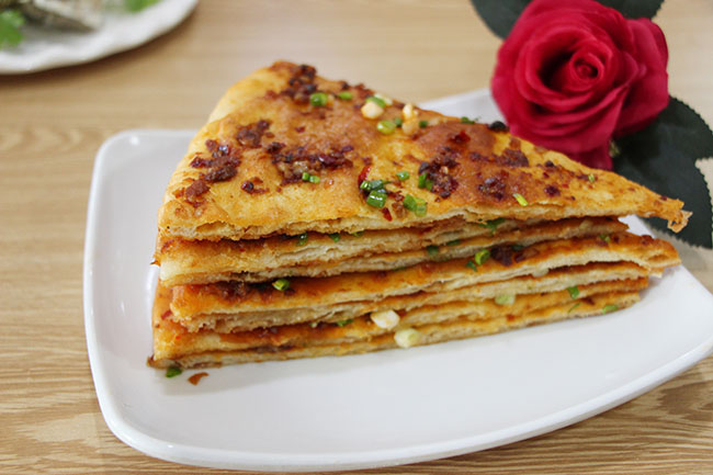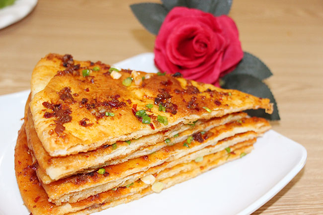 千層餅,又叫“瓤子餅”,是山東東平接山鄉(xiāng)一帶的傳統(tǒng)名吃之一,歷史上以鄣城村路邊客棧制作的風(fēng)味較美。這種餅外邊用一層面皮包起來,而內(nèi)有十?dāng)?shù)層,層層相分,烙熟后,外黃里暄,酥軟油潤,熱食不膩,涼吃不散口,且味道香美。千層餅也是浙江奉化溪口的漢族小吃,餅里拌有海苔粉,外面灑上一層芝麻。熟后酥香可口。千層餅也是一種納西族食品。