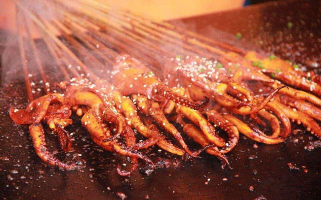 鐵板魷魚是一道街邊小吃,是用鐵板把魷魚煎熟后,再用鐵鏟將魷魚切段,然后撒上特制醬做成。其食材講究新鮮,鮮味完全來(lái)自食材本身。入口沒(méi)有一點(diǎn)腥味,頗受鐵板燒愛好者顧客群喜愛。好吃街、旅游景點(diǎn)、人流密集的小巷等等,都可以吃到鐵板魷魚這一特色小吃。也許你可以看見經(jīng)營(yíng)者不聽的揮動(dòng)著手中的排刷,不停地翻滾著手中的魷魚串,鐵板上發(fā)出“嘖嘖”的聲音,一股香味飄到你的鼻前。我就知道,你口水在流淌了。。。